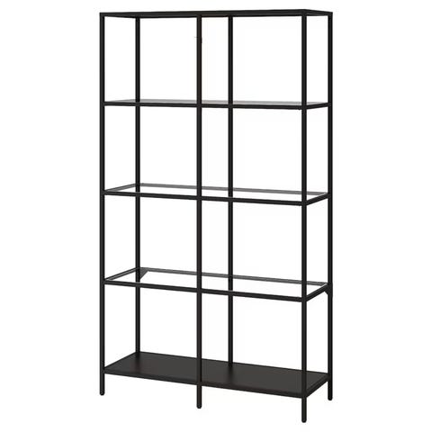 IKEA VITTSJO reol i sort metal og mørk træfiner med glashylde