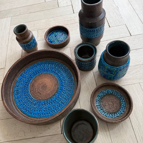 Due to downsizing, I am selling this beautiful Bitossi / Aldo Londi piece from my collection. The decor name is 'Rimini Blu' and the vase measures 18cm tall. It is in good vintage condition, with few imperfections; there are some small chips around the rim which could easily be covered with paint. Priced affordably so anyone can own a beautiful piece of Bitossi 😊 Available to collect from central Copenhagen – shipping is not an option!