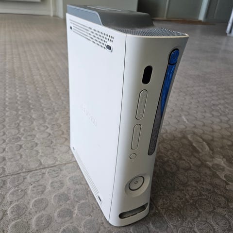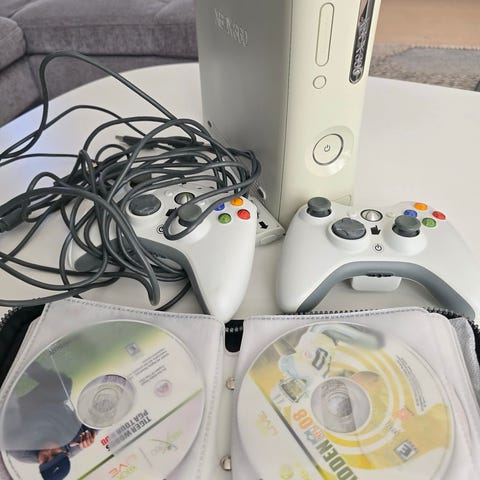 Microsoft Xbox 360 konsol med 60GB harddisk. Inkluderer en controller og tre spil: Star Wars Knights of the Old Republic, Star Wars Knights of the Old Republic II og Oblivion GOTY-edition. Konsollen har standard hvidt design og tilslutninger til AV og strømforsyning.