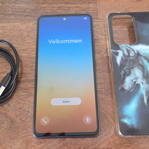 Samsung mobiltelefon med 128 GB hukommelse, har lidt brugsspor men fungere upåklageligt, nyt original batteri dec 2024.