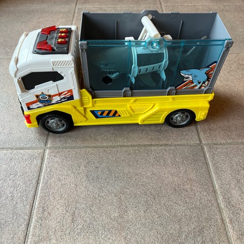 Sæt med stort skib, ubåd, haj, figurer og tilbehør. Skibet har lys og lyd.