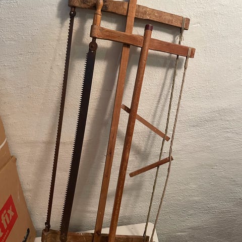 Samling af gamle håndværktøjer bestående af forskellige typer sav, hammer, høvle og måleværktøj. Værktøjerne er primært fremstillet i træ og metal og har et traditionelt design. Egnet til samlere eller til brug i håndværksprojekter, hvor ældre værktøj foretrækkes.