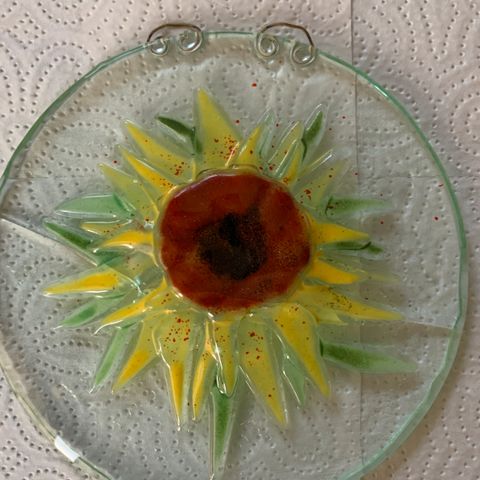 Dekorationsobjekt i klart glas med kugleformede elementer. Genstandens højde og materiale gør den velegnet til dekoration i hjemmet eller kontoret.4 sorte plader kører rundt når solen skinner på glasset