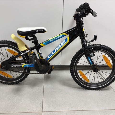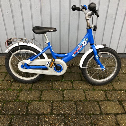 Rocket Børnecykel med 16 tommer hjul i blå farve. Cyklen er designet til børn og har et robust stel samt støttehjul. Egnet til daglig brug og udendørs aktiviteter.