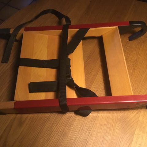 Rød. Kan spændes fast til stol min mindre børn. Men at transportere med sig