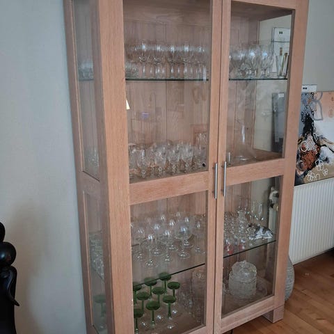 FDB Møblers A90 vitrineskab i lakeret egetræ. Skabet er i find stand, dog kan lidt mindre kosmetiske fejl forekomme.