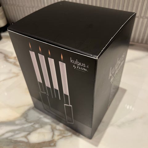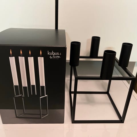 Audo Copenhagen lysestage i sort metal med plads til fire lys. Designet i en kubisk form, der giver et moderne og minimalistisk udtryk. Velegnet til brug som borddekoration eller stemningslys i forskellige rum.