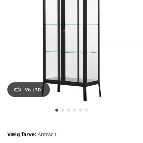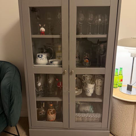 IKEA Linnarp vitrineskab med flere hylder og glaslåger, der giver mulighed for opbevaring og visning af genstande. Skabet har mindre brugsspor og alle hylderne har fået boret et hul i inderste hjørne pga. tidligere monteret belysning (se billeder)
