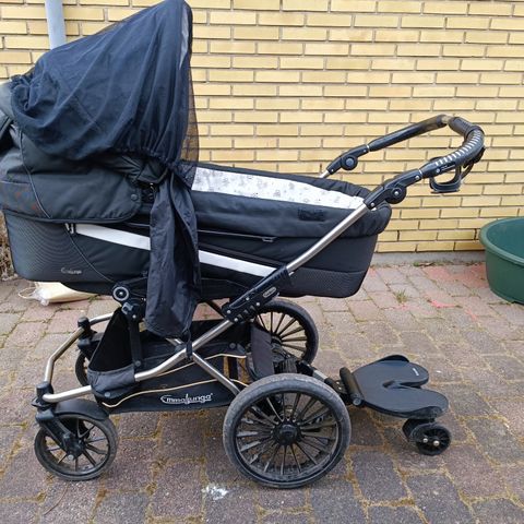 Emmaljunga barnevogn fra 2017. Barnevognen har en rummelig liggedel. Den er udstyret med drejehjul og justerbart håndtag. Tilkøbt madras, regnslag, kopholder og sele fra babydan medfølger. Brugt til to børn.