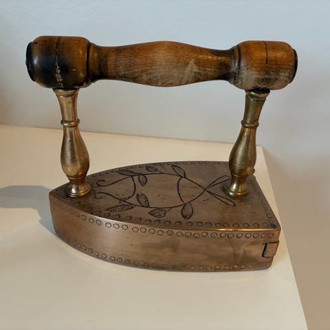 Antikt strygejern fremstillet i messing med håndtag af træ. Designet til manuel opvarmning og strygning af tøj. Klassisk og robust konstruktion uden elektriske komponenter.