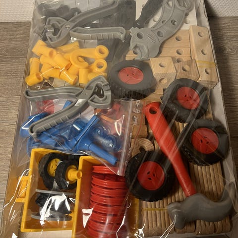 BRIO Builder byggesæt. Så godt som nyt. Der er to forskellige pakker, jeg kan dog ikke huske hvilke. Original værktøj følger også med. Tegningerne har set bedre dage, men der kan stadig bygges efter dem