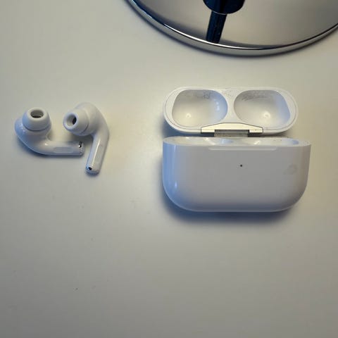 Apple AirPods Pro 2 trådløse høretelefoner med støjreduktion og flere størrelser af silikonepropper. Kommer med opladningsetui og original emballage.