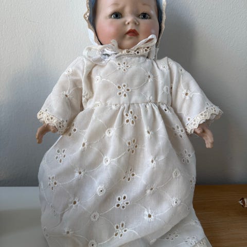 Porcelænsdukke med fin hvid kjole på den ene arm er faldet af men kan godt sættes på igen med en snor ellers er dukken fin og hel