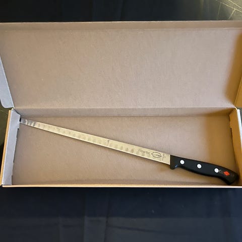 Finsk filetkniv med træskaft og tilhørende læderskede. Kniven har et buet blad designet til filetering af fisk.