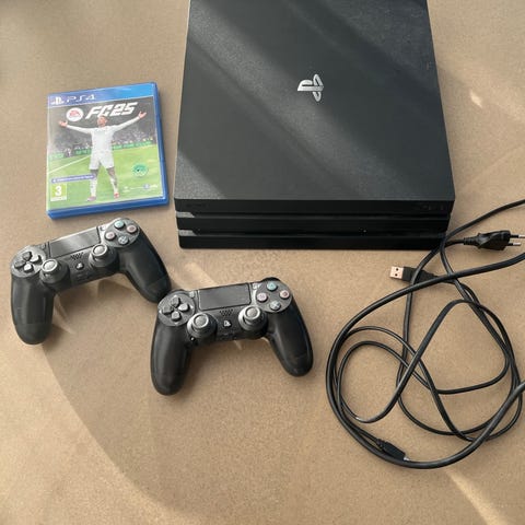 Playstation 4 spillekonsol med to controllere og oplader. Inkluderer FI 22, FIFA 22, FIFA 23, FIFA 25 og Minecraft spil til PS4.