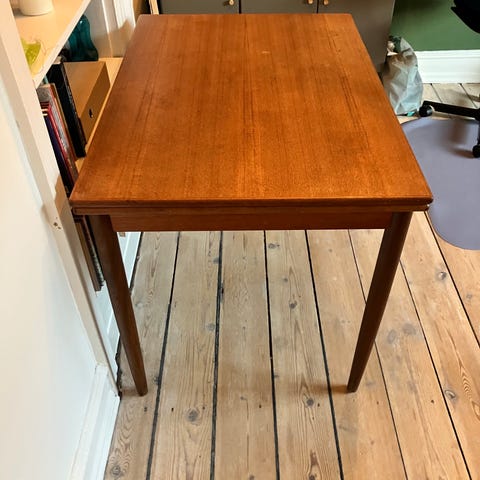 Dansk Design. Spisebord 4 til 10 personer. Smuk patina trænger til en opfriskning med olie. 2xudtræk 50 cm. Total længde udslået 2,30m