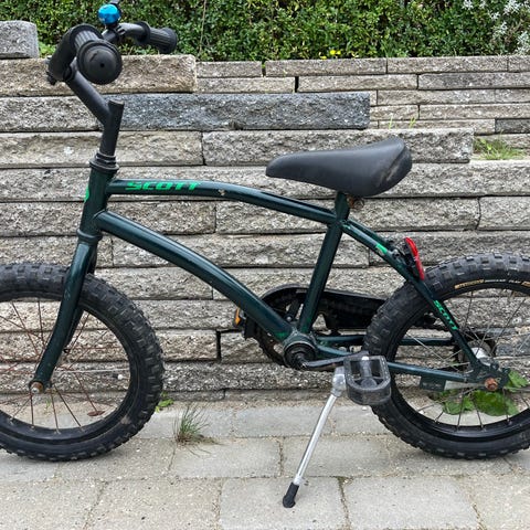Rigtig lækker børnecykel med 1 gear og fodbremse fra Scott. Brugt til at lære at cykle på, deraf mærker på sadelpind fra “cykelpind”.