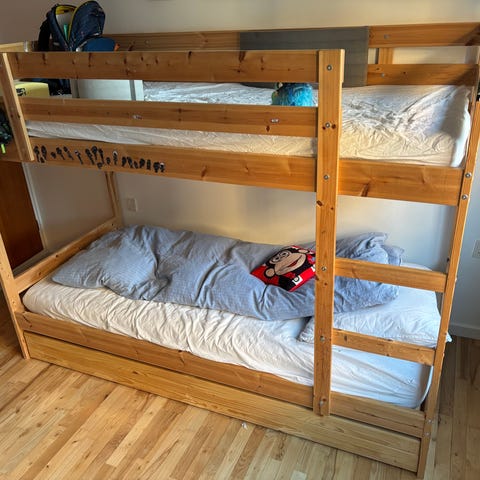IKEA køjeseng i træ og hvid med plads til to personer. Sengen har en stige til adgang til øverste køje og sikkerhedsskinner på øverste seng. Designet til børneværelse med robust konstruktion og funktionelt design.