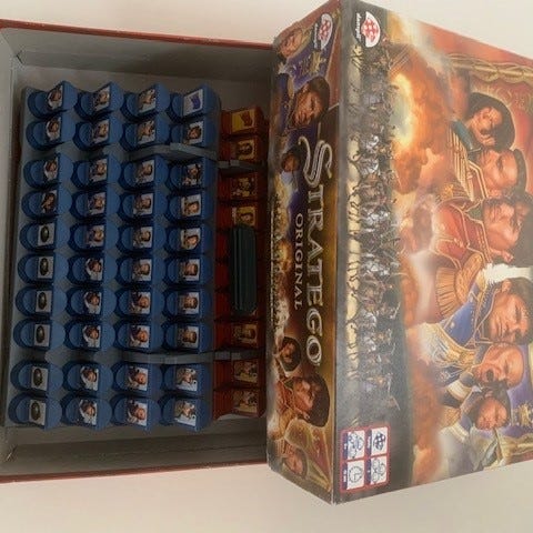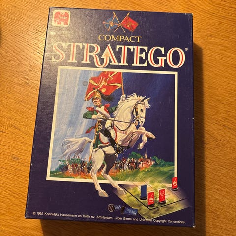 Stratego Battle Cards brætspil med spillebrikker i rød og blå farve, spilleplade med grid-mønster, og kort til spillet. Spillet indeholder regler og er designet til to spillere.