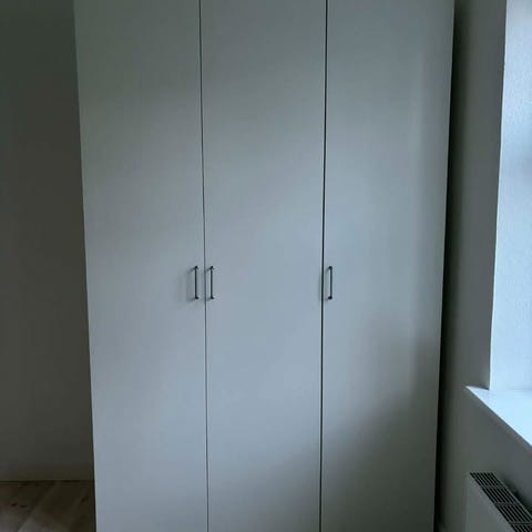 Flot Pax tredobbelt klædeskab med spejllåge sælges. Skabet har fem hylder og dobbeltskabet har tre store udtræksskuffer og en trådnetskuffe - samt bøjlestang. Kun været brugt i to år. Er fra dyrefrit og røgfrit hjem.