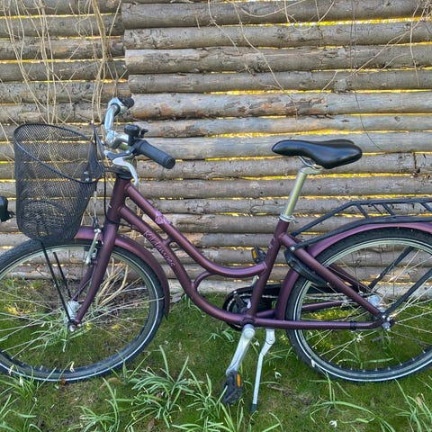 Pink pigecykel med stel i pink farve. Udstyret med 3 gear og bagagebærer. Cyklen har kurv foran og støtteben. Egnet til børn.