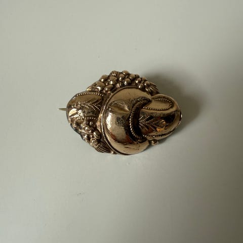 Forgyldt broche formet som en fugl, der griber om en gren, med grøn sten, som øje.