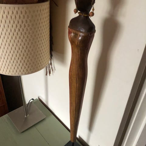 Afrikansk pige figur i træ mørkebrun farve, Virkelig flot og cool afrikansk pige figur skåret i træ. Ved ikke hvilken træsort det er. stå rigtigt fast på bord, fejle intet sendes gerne mod betaling (den er let tung) str. H. 42 cm. x 17 cm. bred, kan hentes for 100 kr.