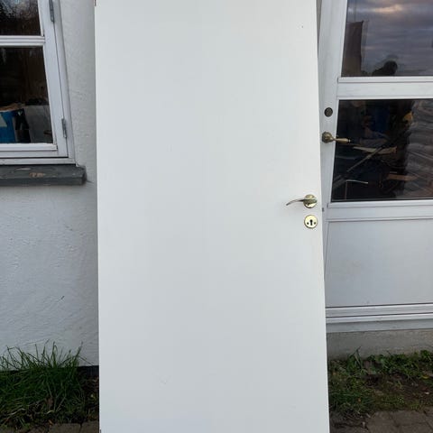5 Hvide indvendig døre med tilhørende karm og messingfarvet håndtag. Døren er opdelt i tre paneler og er velegnet til brug i hjemmets indvendige rum. Materiale og præcise mål er ikke angivet.