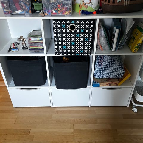 IKEA børnemøbel opbevaringsreol med flere plastikbakker i forskellige farver (grøn, blå, hvid).