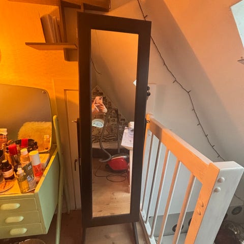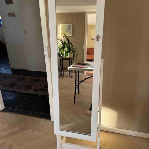Smykkeskab fra Lidl. Aldrig åbnet. Skabet indeholder 1 skuffe, 4 hylder + knager til øreringe/halskæder