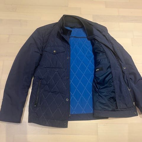 Hugo Boss Jakke til herre i størrelse XL. Jakken er blå og lavet af dun, hvilket giver isolering og varme. Designet til udendørs brug med en let og polstret konstruktion.
