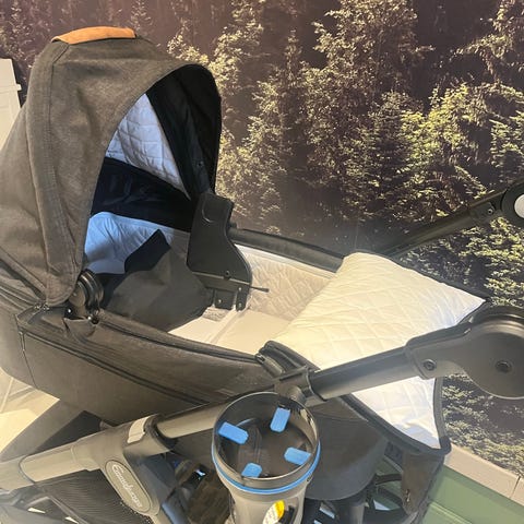Medfølger 2 regnslag (med små huller, men fungerer fint) og myggenet. Samt en ekstra cacoon Company madras købt hos naturebaby og aldrig brugt.