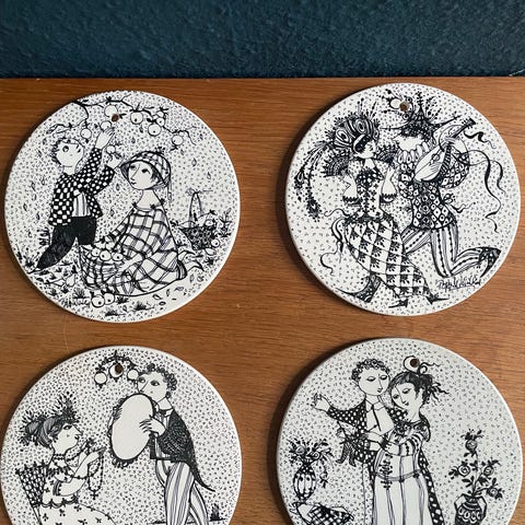 Bjørn Wiinblad. Små blanketter i porcekæn med Oktober Paradis og December Mirakel på bagsiderne og typiske Wiinblad motiver på forsiderne. De måler 4,5 cm i diameter. Se billederne. Bjørn Wiinblad