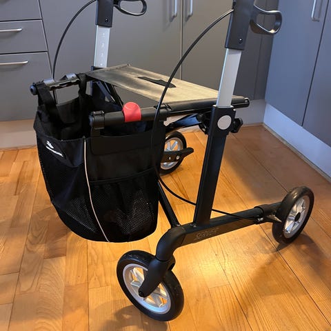 Rollator super letvægtsmodel, nem at folde sammen og betjene. Mærke: Rehasense Server. Til ikke så høj person. Brugt få gange indendørs. Der medfølger "bord" som fra ny er ekstraudstyr - se billeder. Kan efter aftale også afhentes i Helsingør.