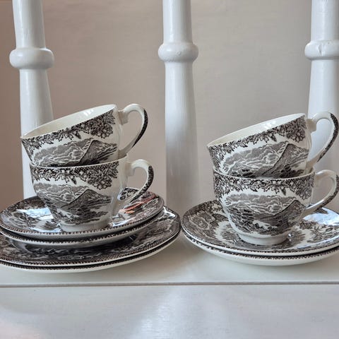 Enoch Wedgwood English fajance lake Awe og lake katrine tallerken sæt med dekorative mønstre. Tallerkenerne er lavet af porcelæn og har en klassisk sort-hvid farve. Sættet inkluderer flere tallerkener, som kan bruges til servering af mad.