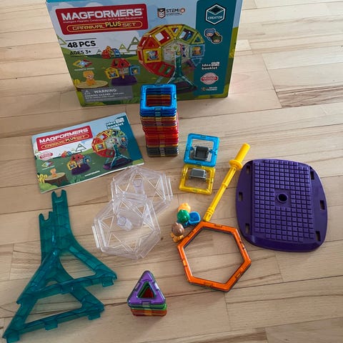 Fedt byggesæt med lys og lygter, der kan lades op med medfølgende ladestik. Ekstra "magnetklodser" i pakken. Kassen er gået i stykker, men fungerer fint som opbevaring.