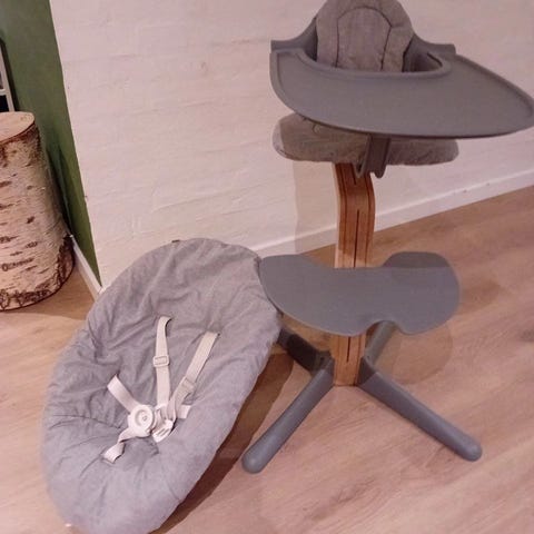 Stokke Nomi prisvindende højstol designet til børn fra 0 år og opefter. Højstolen har en justerbar konstruktion med egetræ og hvid plast, så barnet kan vokse med stolen i mange år. Der medfølger Newborn babyindsats med seler. Indsatsen er justerbar i hældning. Derudover sæde- og ryghynde i gråt stof. Stolen og tilbehør er i super flot stand. Stoffet på sæde- og ryghynde samt på Newborn-indsatsen er pletfri og absolut uden slid.
