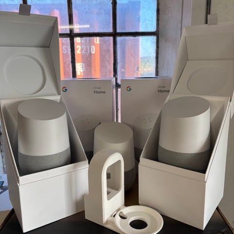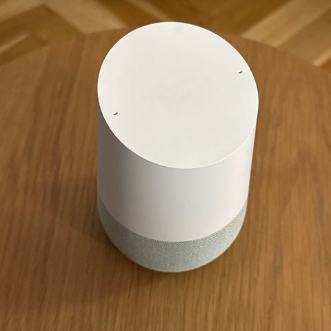 Google Home smart højttaler i hvid farve. Enhed til stemmestyret afspilning af musik, styring af smarte enheder og adgang til Google Assistent funktioner.