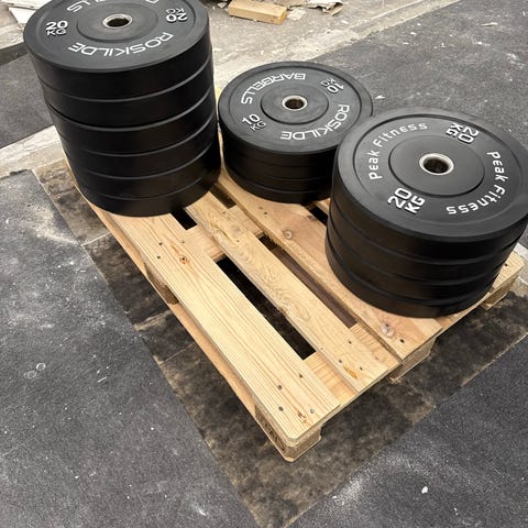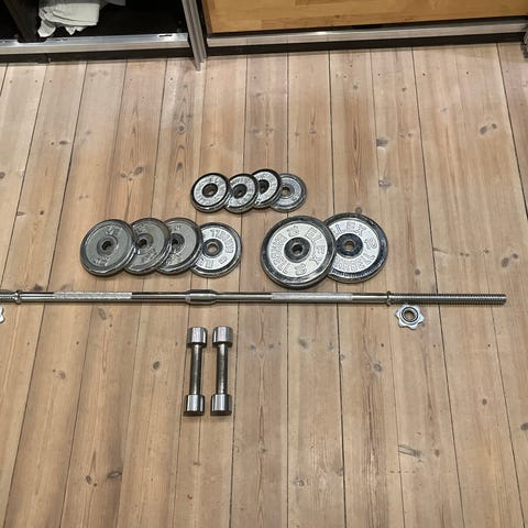 Sæt bestående af en vægtstang, samt låse til fastgørelse af vægtskiverne. Vægtskiverne er fremstillet i metal og plast og er egnet til styrketræning.