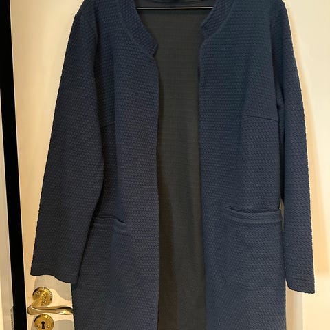 Pæn og velholdt, har lidt fnuller, som det meste uld afgiver, som nemt kan fjernes med en saks. 90% uld. Tyk og varm. Kan ikke se str, men ligner en L.