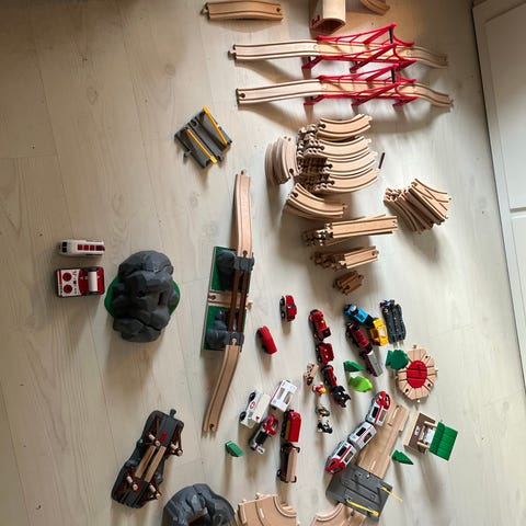 BRIO togbane indeholdende 11 lange lige skinner, 44 runde skinner, 2 korte lige skinner, 2 broer, 2 bjergskinner, 2 elektriske lokomotiver, 2 af de helt gamle uden batteri, 10 togvogne, hvoraf 2 har mistet en magnet. 3 biler, 2 traktorer og 1 kran med gods ( også den gamle uden batteri).