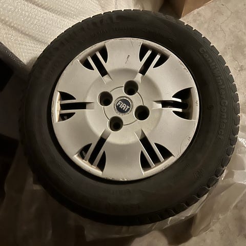 1 sæt vinterhjul fra 2008 Fiat Panda. Fælge er rustne, men holder luft. De er monteret med 2 stk Conti ts 860 vinterdæk fra 2018 med ca 5,5 mm mønster + 2 stk imperial snowdragon hp fra 2019 med ca 6.5 mm mønster. De er afbalanceret og klar til montering. De er alle godkendt til vinterkørsel.