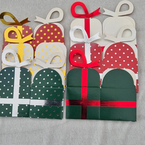 Gavebånd, tusser og farveblyanter, saks og farvet papir