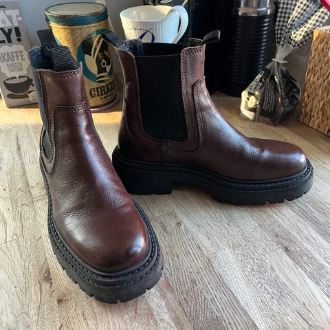 Støvlerne dækker benet op til læggen og har en firkantet tåform.