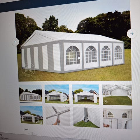 Udendørs telt med målene ca. 6x8 meter. Teltet har en metalramme og er fremstillet i kraftigt materiale i farverne hvid og blå.