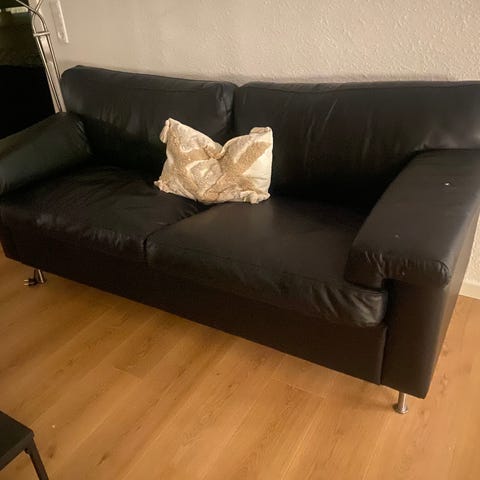 En dobbelt og en enkelt recliner sofa i kunstlæder med et par mindre skader. Den dobbelte kan købes separat for kr. 900 og enkeltstolen for kr. 500. Kan også købes samlet med lille rabat for kr. 1.200.