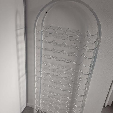 Hvidreol fra ikea, som er blevet malet hvid. Plads til 9 flasker. Har stået ovenpå et overskab i køkken.