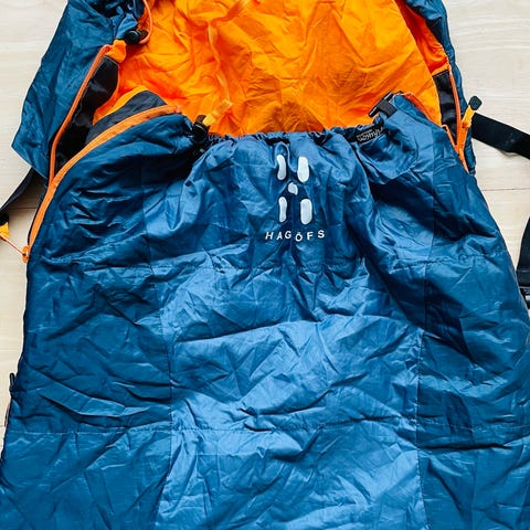 Haglöfs sovepose med sort yderside og orange inderside. Designet til udendørs brug med fokus på funktionalitet og komfort. For eksempel i en pulk på ski