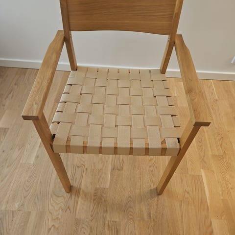 Sælger to flotte spisebordsstol med armlæn, stolene har et vævet sæde og stel i massiv eg. Aldrig brugt, kun samlet. Ny pris 1798.- for 2stk.