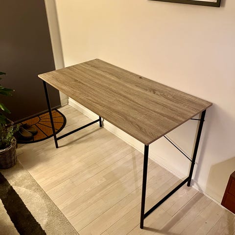 Jeg har boret et hul, til kabler, i venstre bagside af bordet, men det kan ikke ses hvis man har bordet stående op ad væggen.